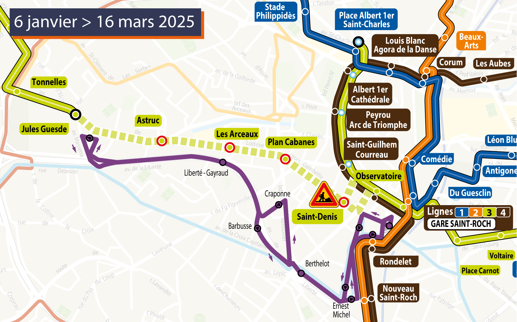 Pour permettre les travaux de renfort de la dalle en béton et la pose de l’appareil de voie manquant, la ligne 3 et à nouveau interrompue entre les stations « Jules Guesde » et « Observatoire » du 6 janvier au 16 mars 2025. La partie sud de la ligne 3 est prolongée de la station « Observatoire » à la station « Place Albert 1er – Saint-Charles » par le boulevard du Jeu de Paume afin d’utiliser le titoir situé après cette dernière station pour le retournement des rames. Ce prolongement évite l’utilistaion de l’aiguille située entre « Observatoire » et « Gare Saint-Roch » qui peut gêner le passage des rames de la ligne 4.