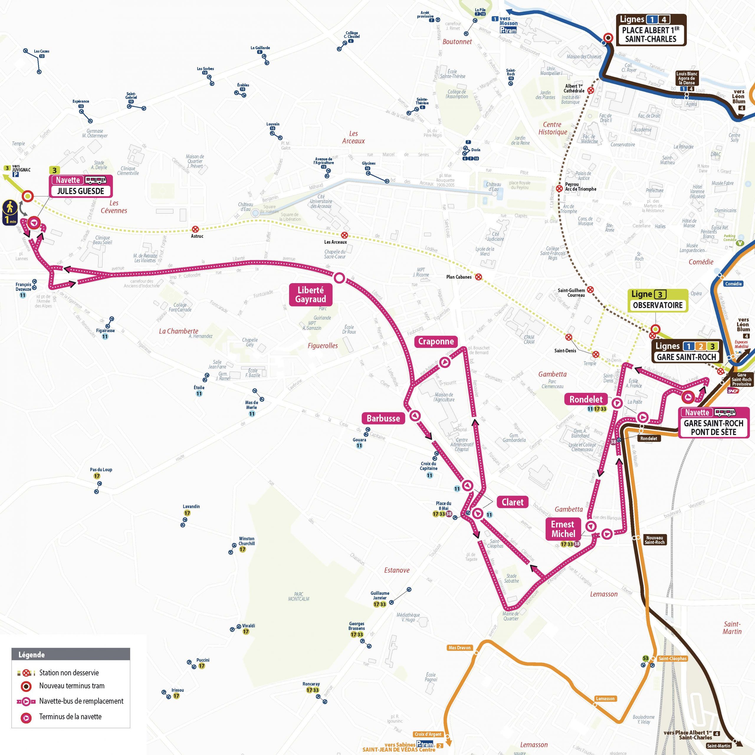 La ligne 3 n’est plus scindée en deux mais est déviée entre la gare Saint-Roch et Port-Marianne par le quartier des Près d’arènes habituellement desservi par la ligne 4. Cette dernière ligne quant à elle, réalise toujours un trajet circulaire mais passe par la place Carnot au lieu des près d’arènes entre la gare et les rives du Lez.
