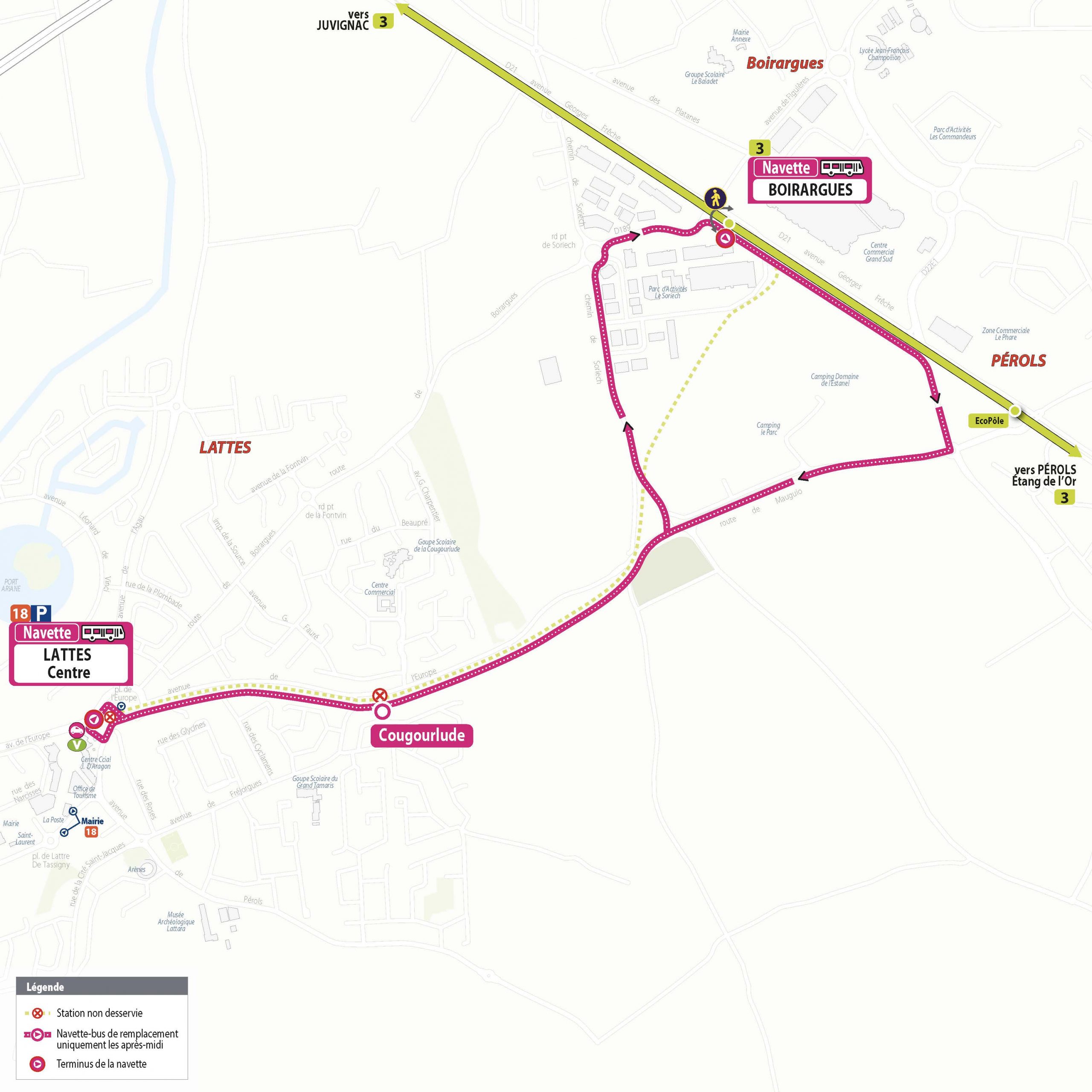 Du 24 juin au 1er septembre, tous les jours du 13h à 20h environ, la ligne 3 ne dessert pas la branche de Lattes. Un bus de substitution est également mis en place avec un intervalle de :